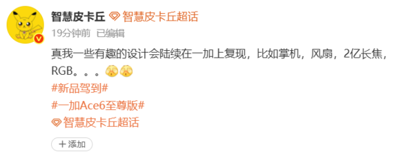 【CNMO科技消息】4月8日,博主“智慧皮卡丘”在社交媒体上透露,真我部分特色设计将会在一加产品上陆续复现,涉及机型可能包含一加Ace 6至尊版,具体设计方向涵盖掌机、风扇、2亿长焦、RGB等元素。