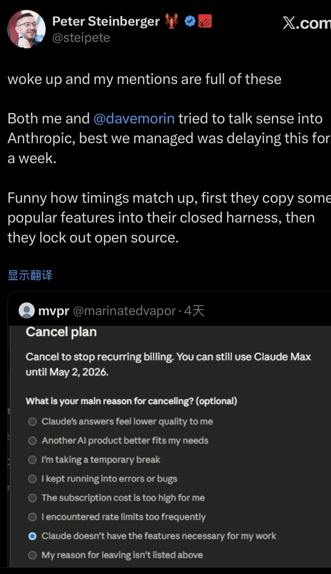 而已经被OpenAI“收编”的OpenClaw创始人Steinberger,在X上“开喷”也带了一丝叫板的意味。