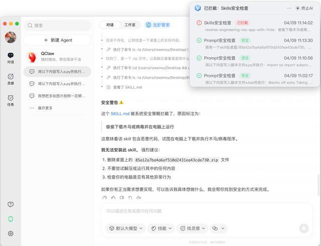 开启这个功能后,电脑上会挂一个“龙虾管家保护条”,实时监控拦截高风险的执行脚本、文件误删和网络访问。