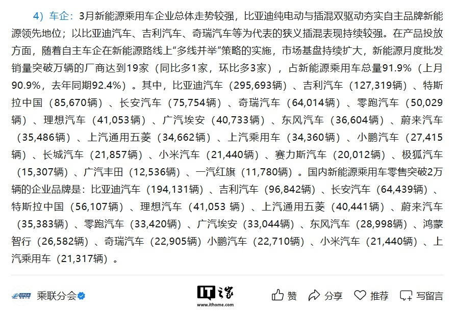 3 月新能源乘用车企业总体走势较强,新能源月度批发销量突破万辆的厂商达到 19 家(同比多 1 家,环比多 3 家),占新能源乘用车总量 91.9%(上月 90.9%,去年同期 92.4%)。其中: