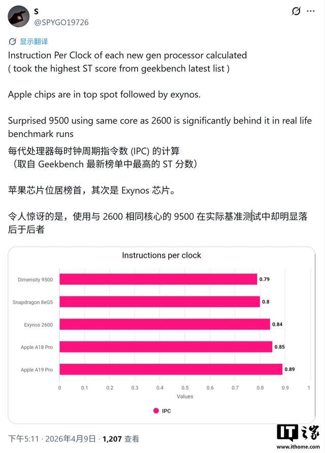 IT之家 4 月 10 日消息,消息源 @SPYGO19726 昨日(4 月 9 日)发布推文,基于 GeekBench 6 最新榜单中的单核成绩,计算出主流手机芯片的 IPC(每时钟周期指令数)数据,称苹果 A19 Pro 再次问鼎宝座。