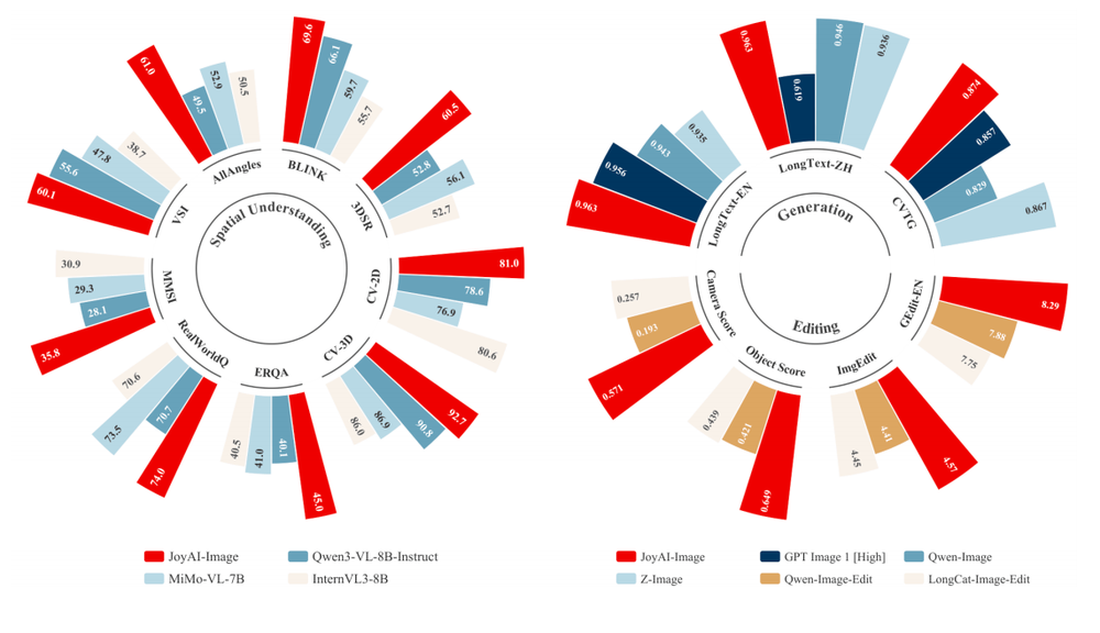 从公开评测来看,JoyAI-Image-Edit各项指标显著领先,迈进了国际第一梯队:空间理解刷新同量级开源模型SOTA,达到世界一流水平,大部分指标媲美或超越闭源模型 Gemini 2.5 Pro。长文本生成中英文双语领先,图像编辑能力全面覆盖,空间编辑精度甚至超过部分视频世界模型。