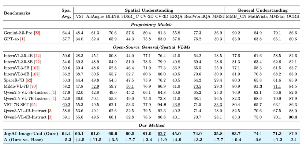 得益于这种设计,在2D语义感知、3D空间理解、4D时空推理三个层级共13项Benchmark上,JoyAI-Image-Edit在9项空间理解Benchmark上均取得显著提升,平均分达到64.4,追平闭源的Gemini 2.5 Pro。