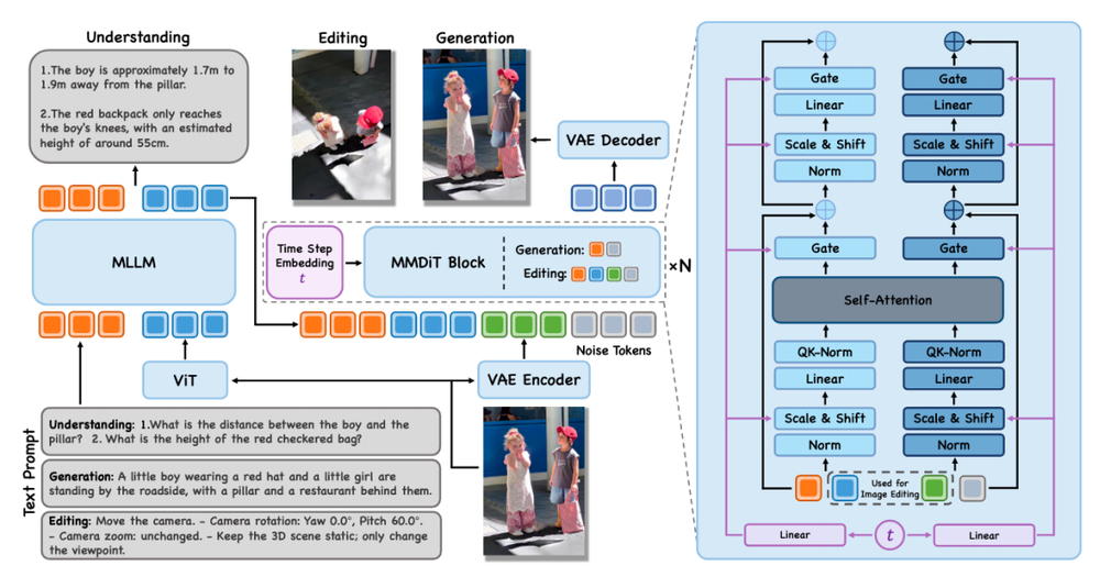 在能力结构上,模型还采用MLLM+VAE+扩散模型(MMDiT)的统一架构。