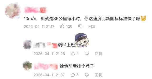 还有B站网友换算了一下,H1的速度可以达到每小时36km,速度比新国标的最高限速每小时25公里还快,以后“骑H1上班”。