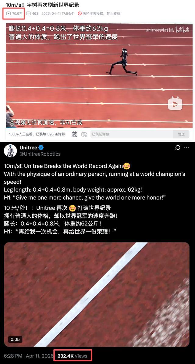 智东西4月12日消息,昨日下午,宇树科技在B站和社交平台X上发出一段新视频,其人形机器人H1跑步速度达到每秒10米,宇树官方称H1用“普通人的体质,跑出了世界冠军的速度”,再次刷新人形机器人的世界纪录。