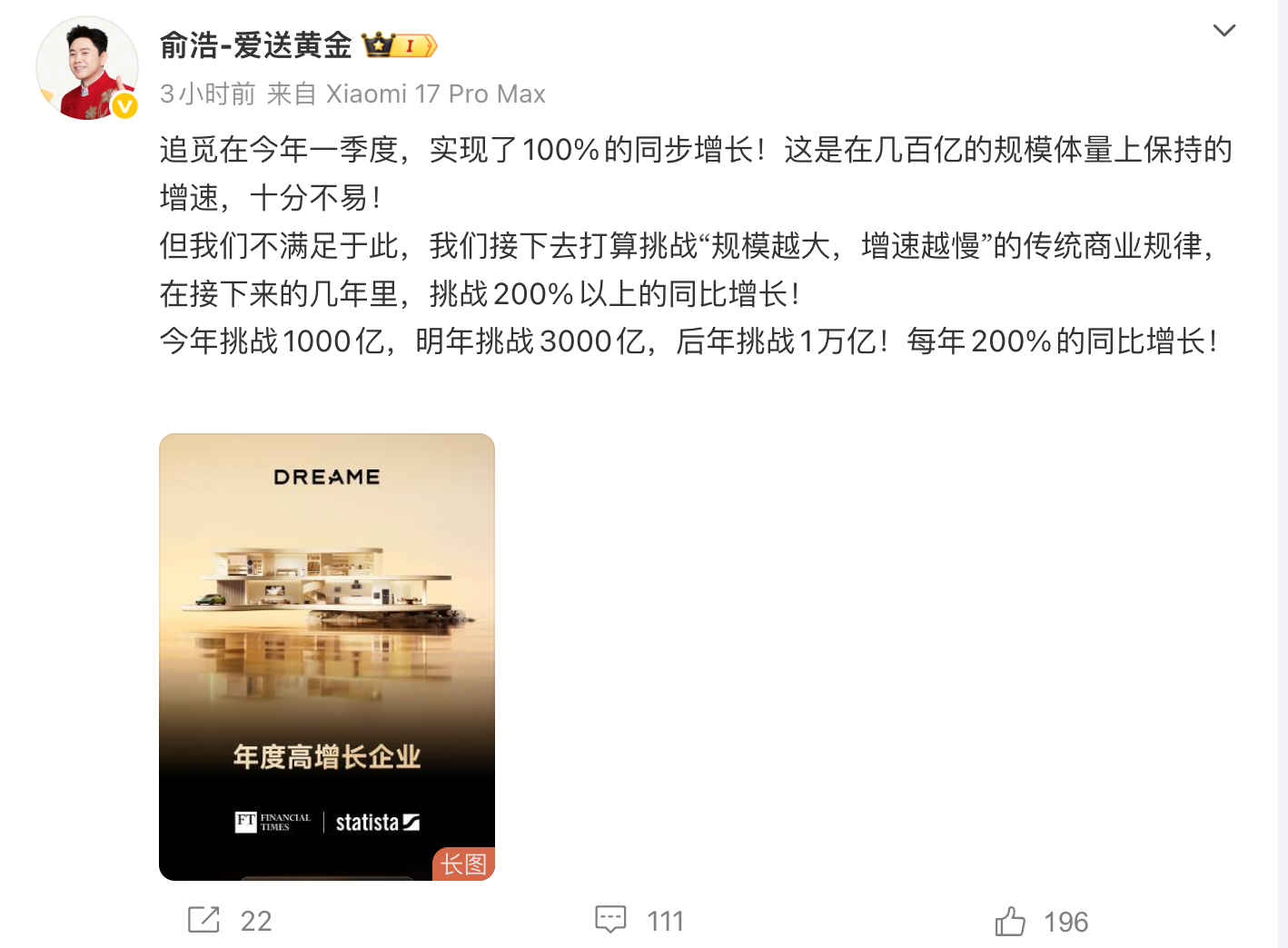 凤凰网科技讯 4月13日,追觅科技CEO俞浩发文表示,追觅在今年一季度,实现了100%的同步增长。这是在几百亿的规模体量上保持的增速,十分不易。俞浩还称:“但我们不满足于此,我们接下去打算挑战‘规模越大,增速越慢’的传统商业规律,在接下来的几年里,挑战200%以上的同比增长。今年挑战1000亿,明年挑战3000亿,后年挑战1万亿。每年200%的同比增长。 ”