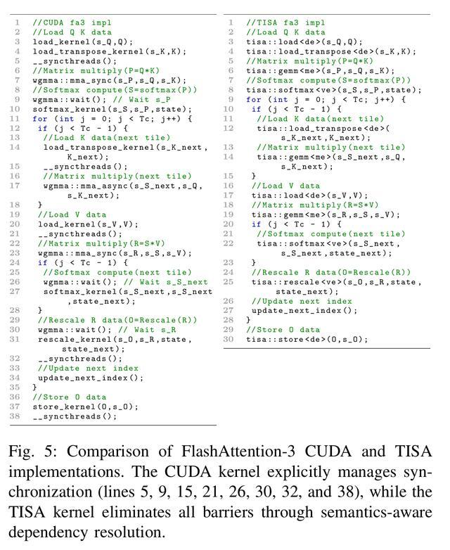 从实际案例测试来看,在目前大模型推理中公认最先进的注意力机制实现FlashAttention-3中,相比CUDA版,TISA版本代码量减30%,同步调用减少50%,性能达到手调基线的95%以上,并且由编译器自动生成的,无需任何手工优化。