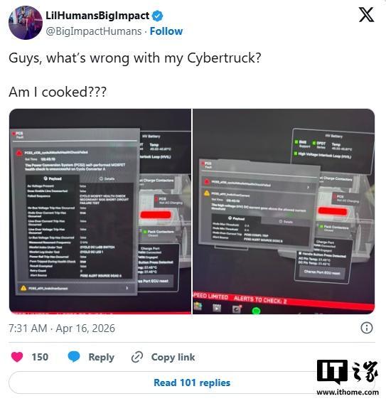 IT之家 4 月 20 日消息,据 not a tesla app 报道,特斯拉 Cybertruck 车主正面临愈发严重的硬件问题,导致大量车主无法在家为车辆充电。该车的功率转换系统(PCS)出现大面积故障,已成为一大棘手难题,不仅让车辆交流充电功能彻底失效,还让车主面临高昂的脱保维修费用风险。该媒体称,特斯拉应召回 PCS 系统。