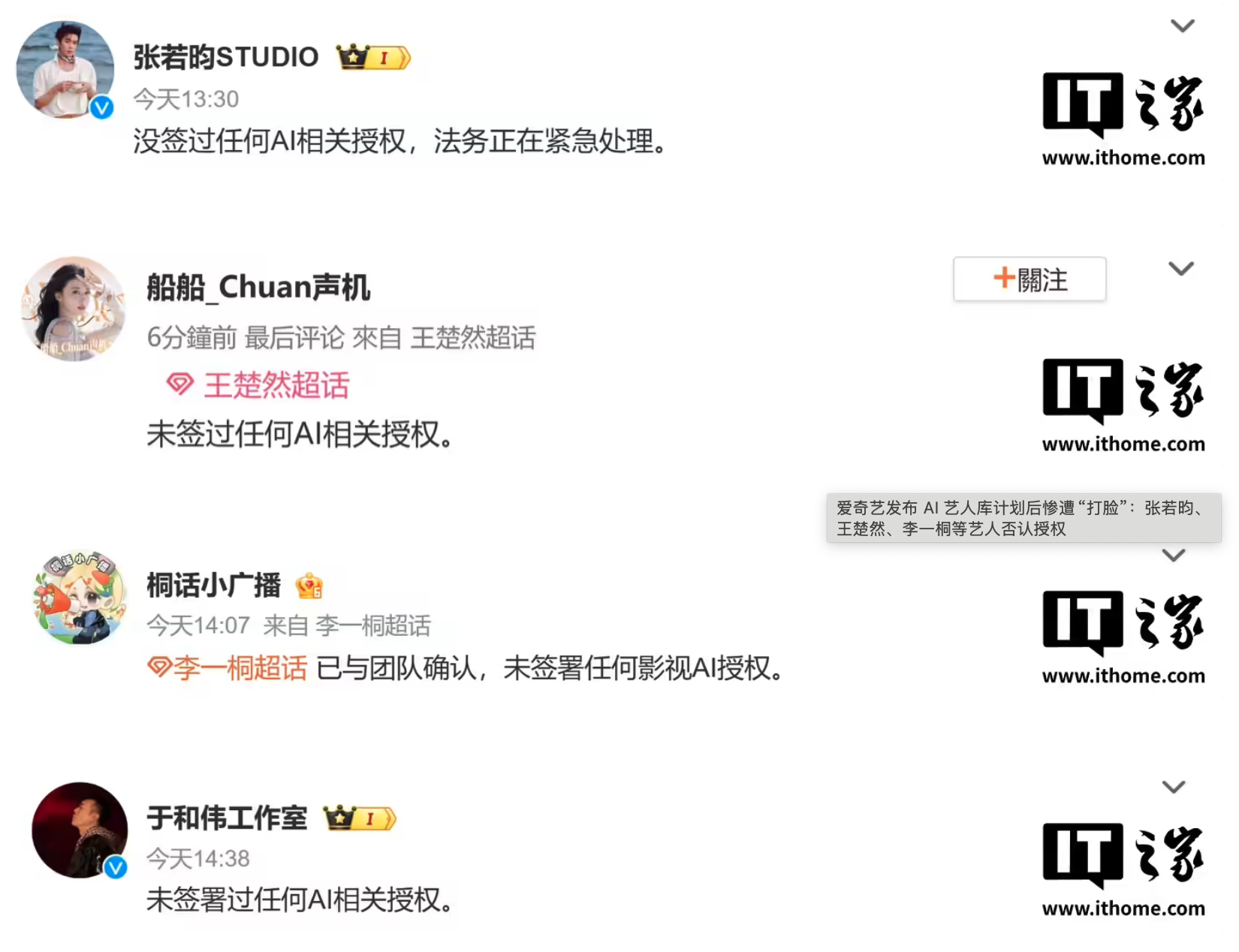 不过本起事件刚刚迎来反转,截至IT之家发稿,张若昀、王楚然和于和伟等艺人均以本人微博账号或工作室 / 超话账号表示,没签过任何 AI 相关授权。