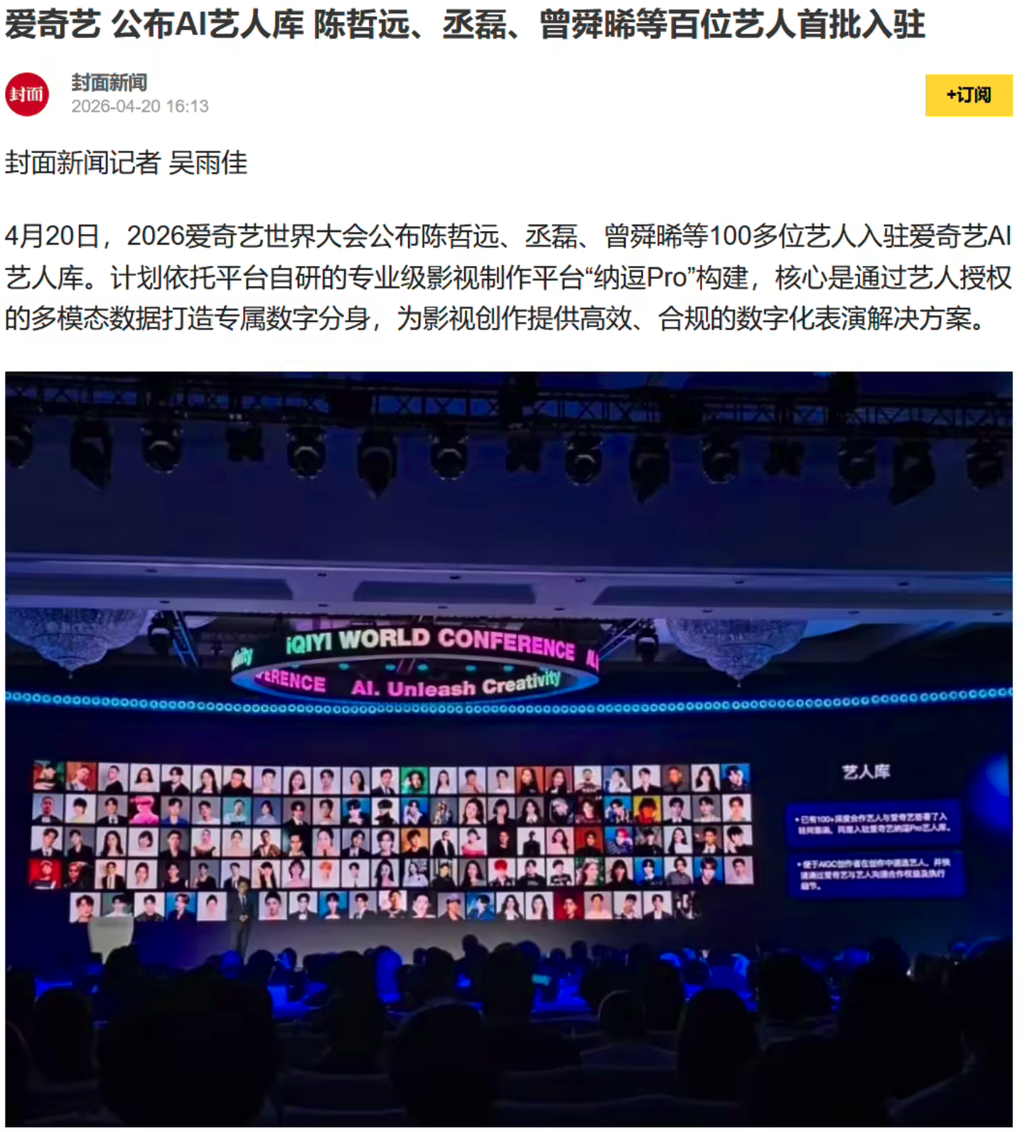 IT之家 4 月 20 日消息,爱奇艺今天在 2026 世界大会公布“AI 艺人库”计划,宣布于和伟、张若昀、马苏、陈哲远、曾舜晞、丞磊、王楚然、房主任、蒋龙等 100 多名艺人入驻。