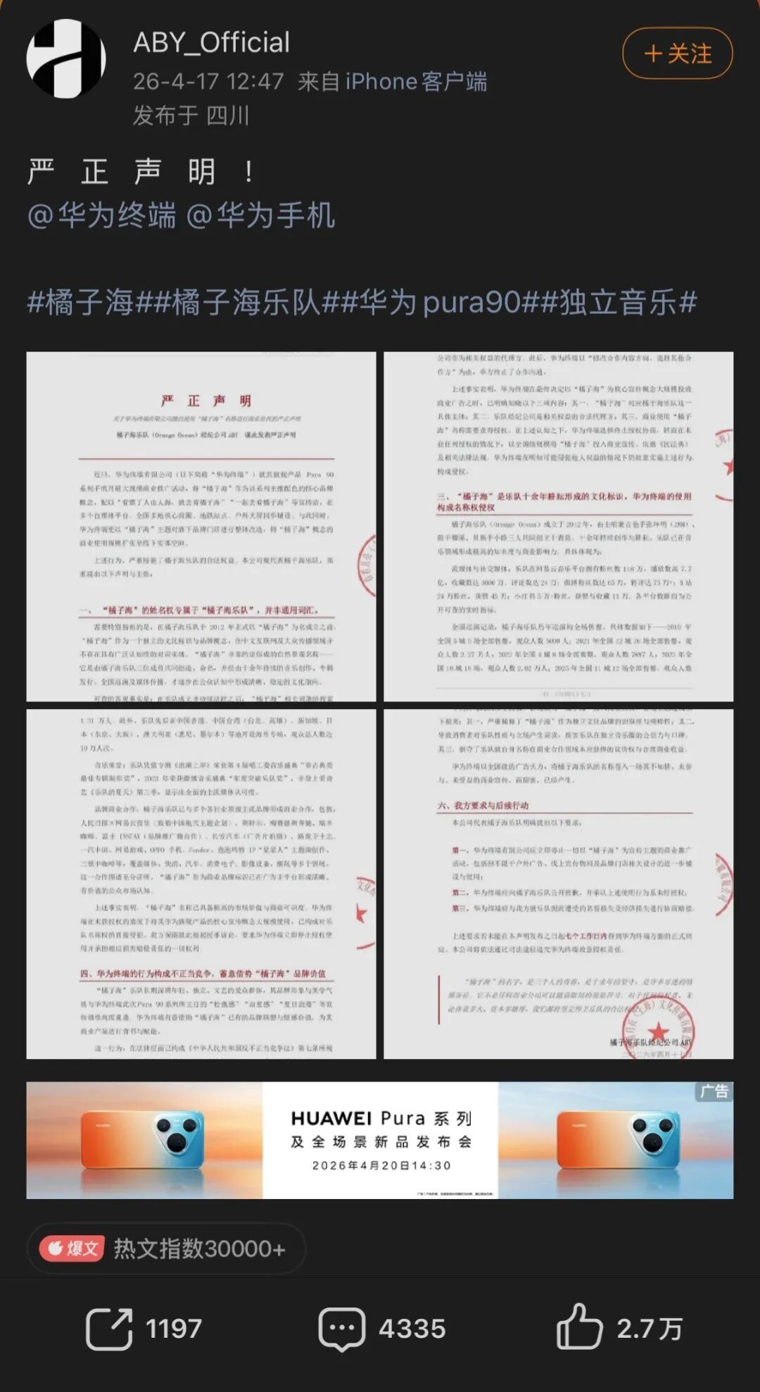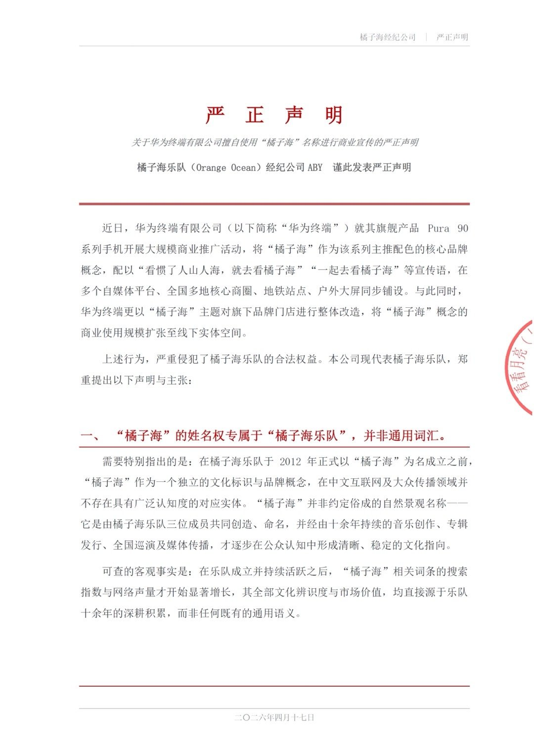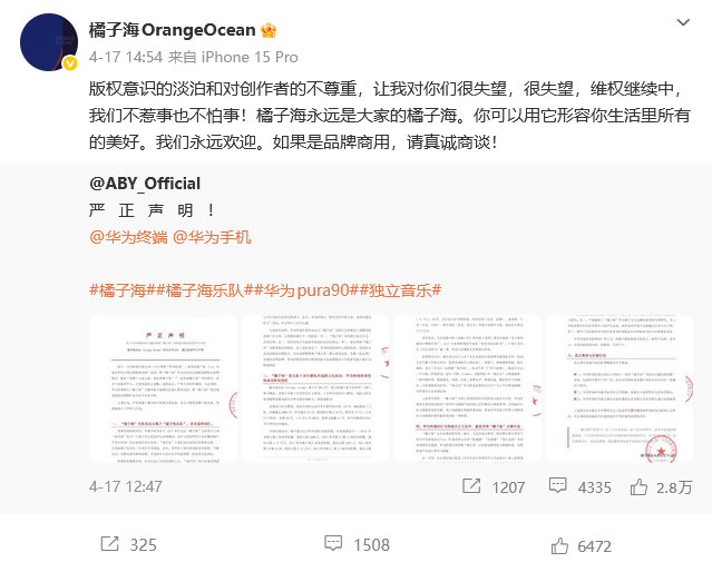 近日,橘子海乐队经纪公司官方微博ABY_Official发布声明,称华为在明知其权益归属的情况下(曾接洽合作但终止),仍在Pura90系列宣传中将“橘子海”作为配色核心概念,使用“一起去看橘子海”等标语,涉嫌侵犯名称权。