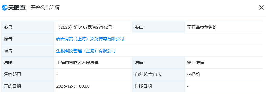 去年,橘子海乐队所属经纪公司看看月亮(上海)文化传媒有限公司就曾起诉一点点奶茶关联的生根餐饮管理(上海)有限公司不正当竞争,案件已在上海市普陀区人民法院开庭审理。