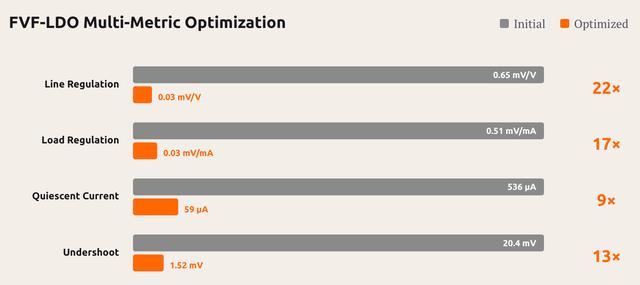 完成任务期间,该模型需要确定功率晶体管尺寸、调整补偿网络并选择合适偏置电压,以使相位裕度、线路调整率、负载调整率、静态电流、电源抑制比和瞬态响应六个指标同时符合规格。