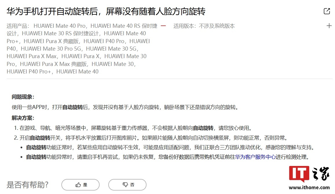 不过IT之家注意到,华为官网近日对“华为手机打开自动旋转后,屏幕没有随着人脸方向旋转”问题进行了更新。相关页面显示,该功能的适用产品新增了 Pura X、Pura X 典藏版、Pura X Max 和 Pura X Max 典藏版。此举或暗示该功能将在不远的将来回归。