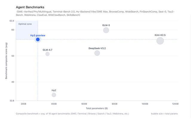 进一步看整体Agent能力,在涵盖16项基准的综合评测中,Hy3 preview以约56分的综合得分,显著高于Hy2(约35分),并与GLM-4.7、DeepSeek-V3.2等模型拉开差距,接近GLM-5与Kimi-K2.5所在区间。