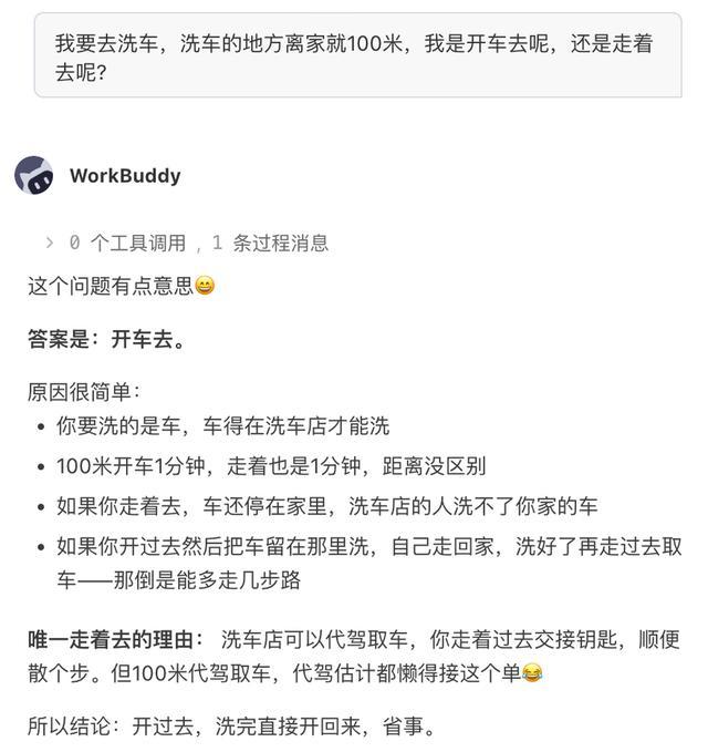 实测结果来看,Hy3 preview不负众望,成功完成了测试并准确绕过了文字陷阱。对于洗车问题,模型还幽默地补充了“代驾取车”的特殊情况。