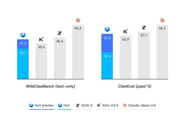 在更细分的Agent专项评测中,Hy3 preview也呈现出类似趋势。在WildClawBench(text-only)中,其得分为45.3,高于Kimi-K2.5、接近GLM-5;在ClawEval评测中达到55.0,超过Kimi-K2.5、接近GLM-5,但与Claude Opus-4.6同样存在差距。