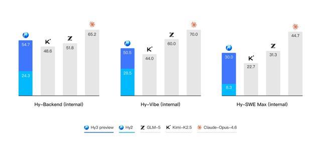 在后端工程任务集Hy-Backend上,Hy3 preview得分达到54.7,超过GLM-5和Kimi-K2.5;在更贴近用户交互的Hy-Vibe评测中,其表现同样领先Kimi-K2.5;在高难度软件工程任务Hy-SWE Max上,Hy3 preview达到30,明显高于Kimi-K2.5、接近GLM-5,但与Claude Opus-4.6仍存在差距。
