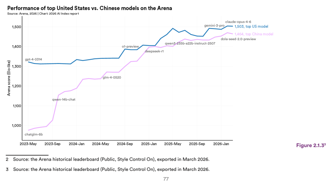 斯坦福大学年度AI报告,每年都会更新一张图 - 中国最强的大模型和美国最强的大模型之间的分数差距。可以看到,上一次中美大模型最接近的时刻,就是2025年初Deepseek R1的发布。如果Deepseek V4真的达到了Opus 4.6的水平,意味着Deepseek再次缩短了中美大模型之间的差距。