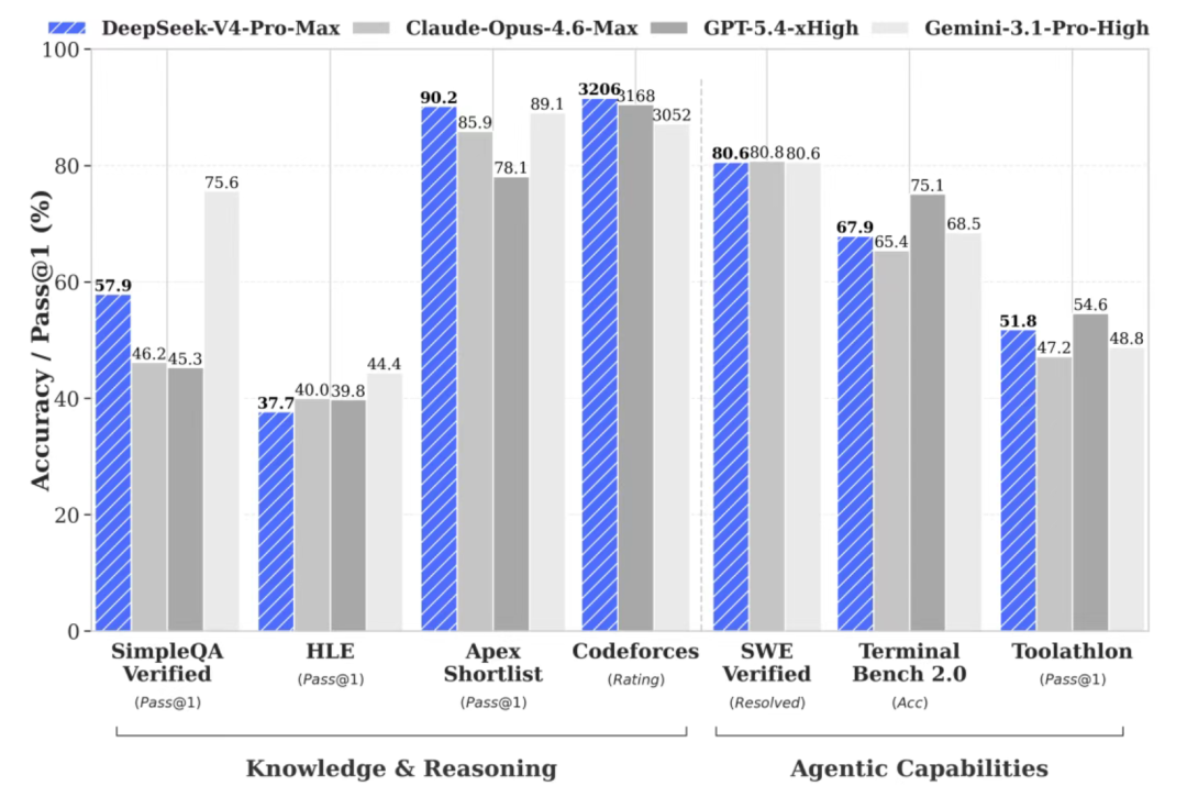 Deepseek 公众号发文称,在Agentic Coding领域,据评测反馈使用体验优于 Sonnet 4.5,交付质量接近 Opus 4.6 非思考模式,但仍与 Opus 4.6 思考模式存在一定差距。