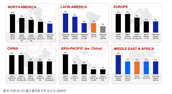 与此同时,苹果则在北美、欧洲和亚太地区占据了销量优势。在欧洲市场,iPhone 16 5G、16 Pro 5G、16 Pro Max 5G以及iPhone 17 5G包揽了销量前四名,三星的S25位列第五。该地区高端智能手机偏好明显,预计去年高端机占其总出货量的60%以上。