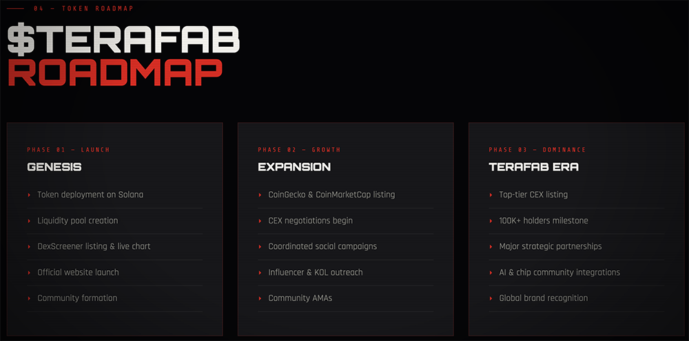 TeraFab官网还放出了发布、扩张、上市三个阶段的路线图: