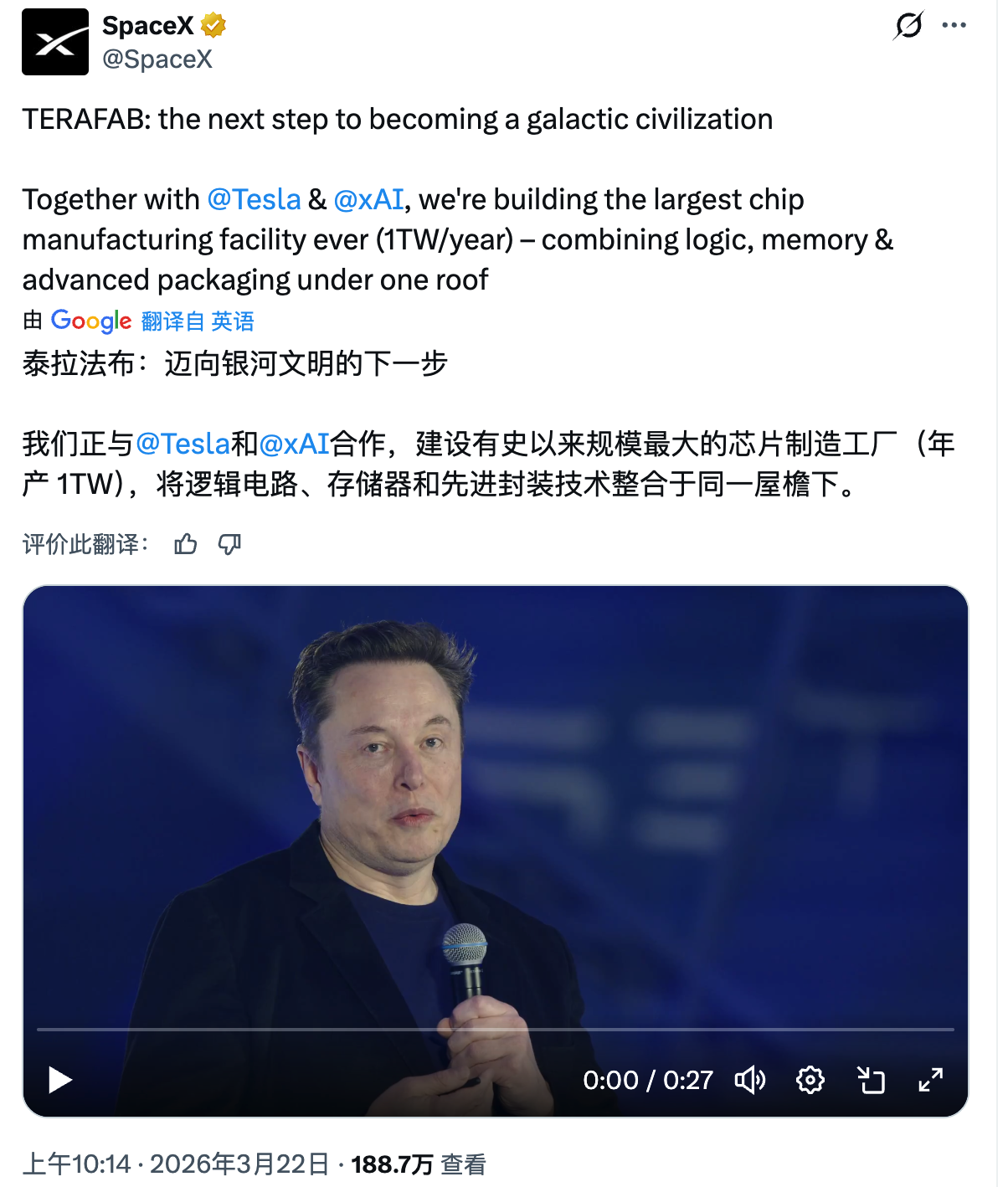 这使得 Terafab 不再只是特斯拉的供应链延伸项目,而更像是马斯克旗下多家公司共同参与的一项基础设施布局。