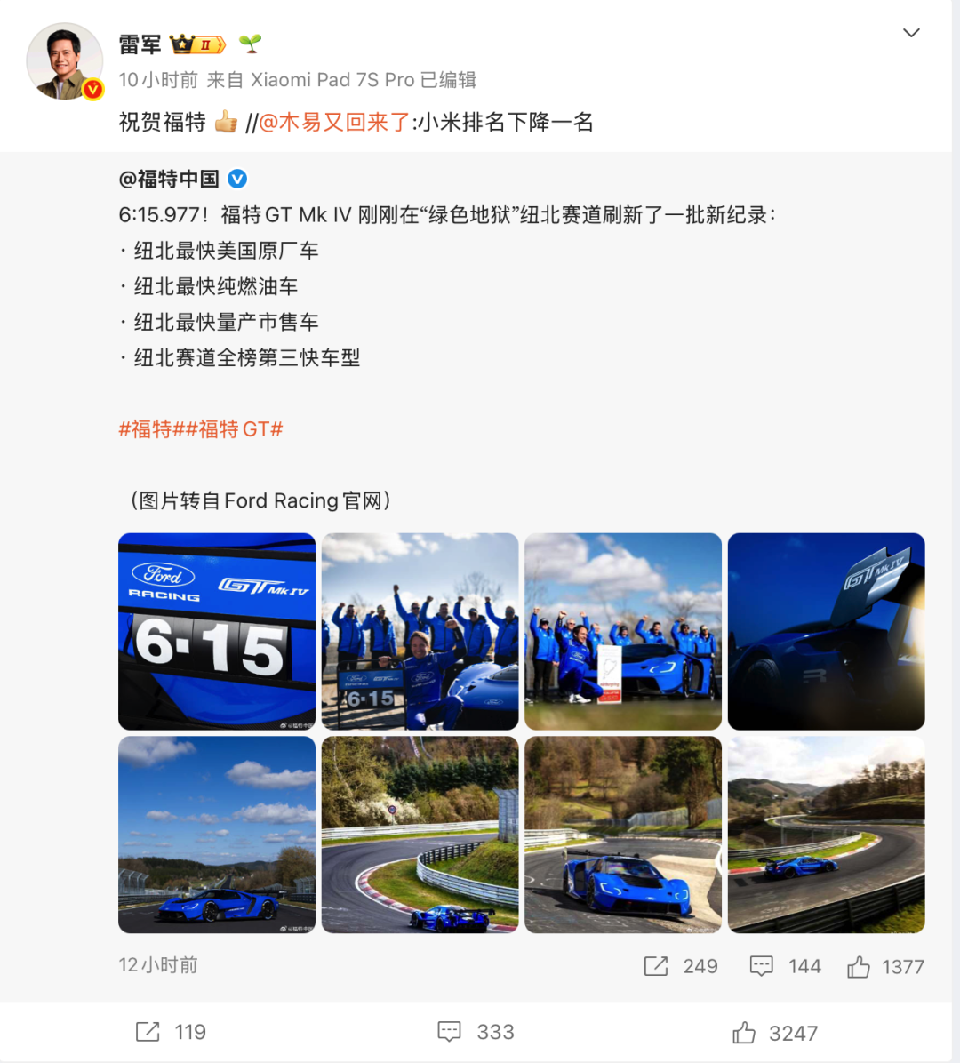 福特 GT Mk IV 以 6 分 15 秒 977 的成绩超越小米,升至第三位,同时成为纽北最快的纯燃油车,也是纽北最快的量产市售车。