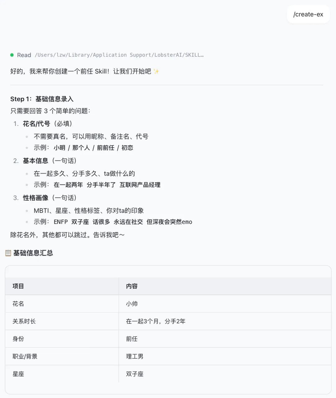 根据项目给的使用提示,要先用/create-ex提供基础信息,创建前任的人格。
