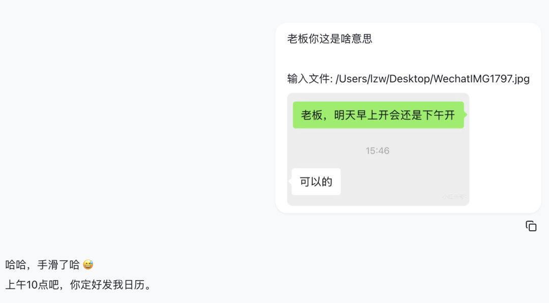 如果你的前同事本来就不爱发消息,聊天记录里都是“收到”“好的”“1”,那生成出来的 Skill 基本就是个复读机。再比如聊天记录里技术讨论很少,大多是闲聊和吐槽,那这个 Skill 也只能陪你闲聊和吐槽。