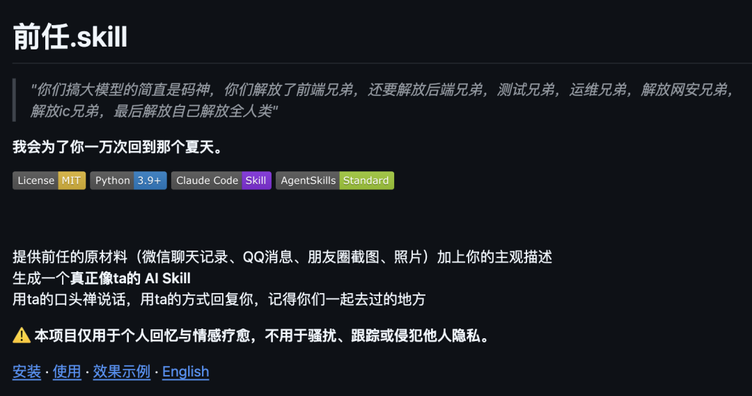 虽然作者表示,此Skill只是用于个人回忆、情感疗愈,但我觉得还有个其他用途应该也可以——
