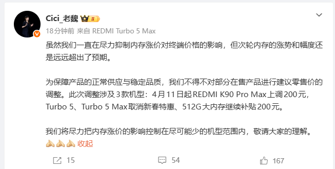 凤凰网科技讯 4月3日,小米通讯技术有限公司发布官方说明,受全球存储芯片等关键零部件价格持续大幅飙升影响,公司将自2026年4月11日00:00起,对Xiaomi及REDMI部分在售产品的建议零售价进行调整。